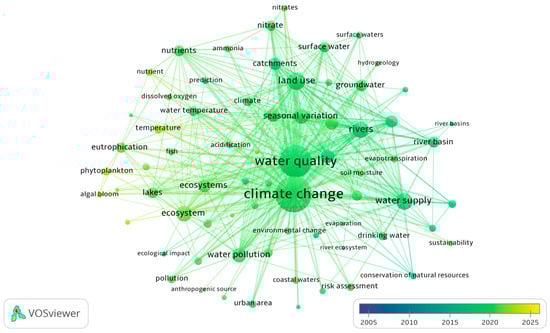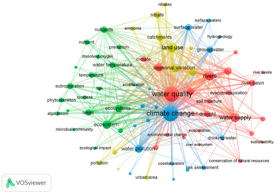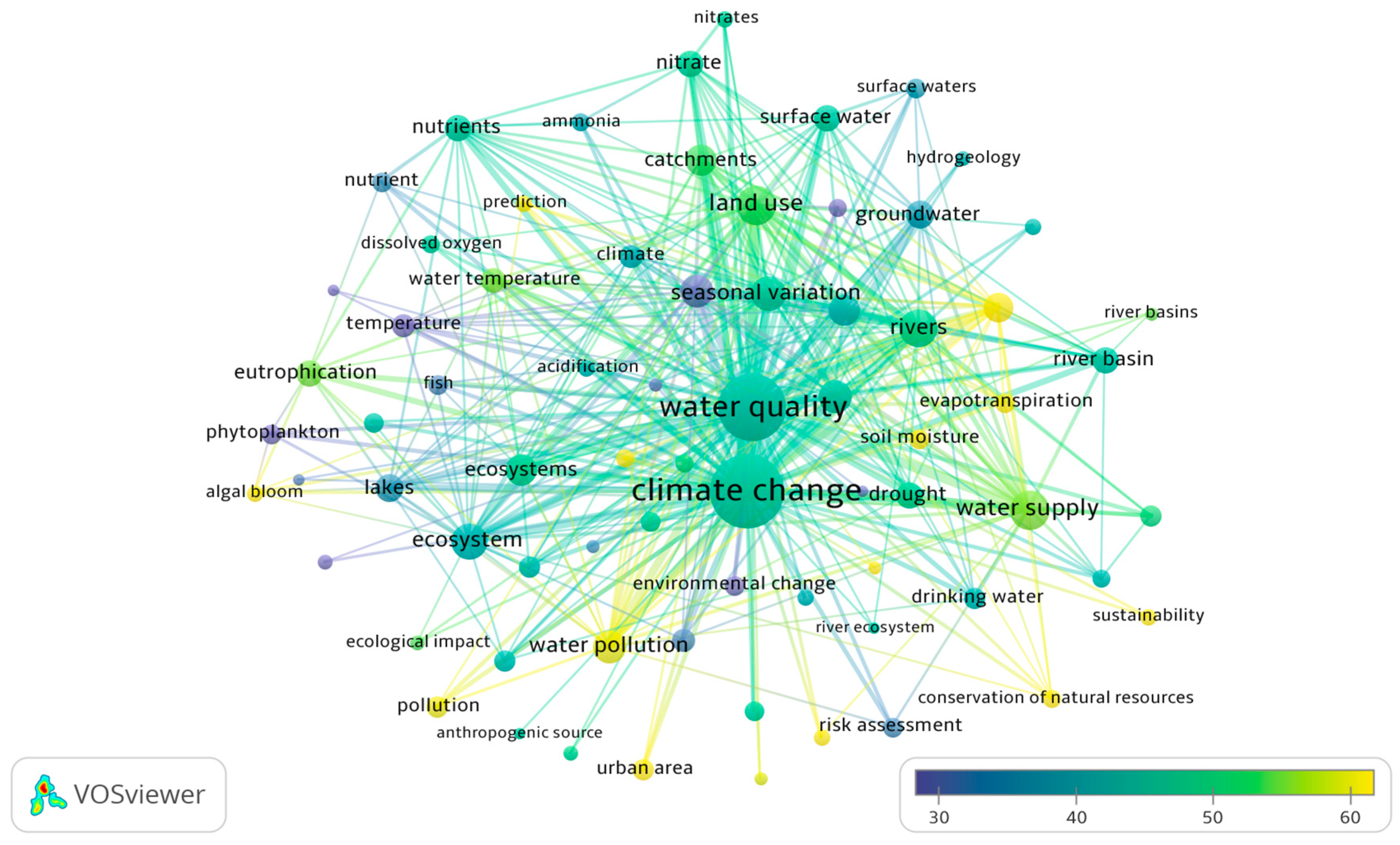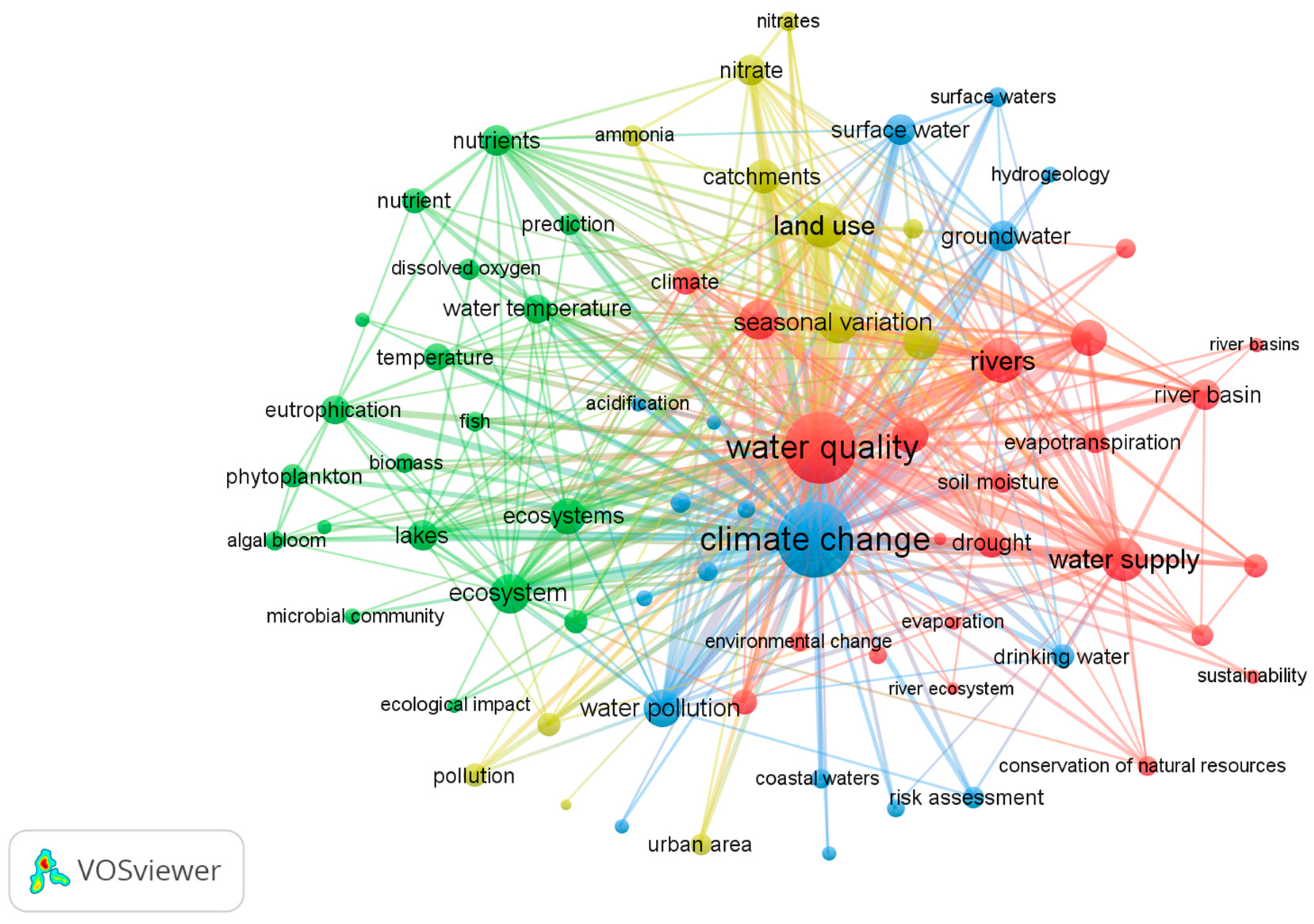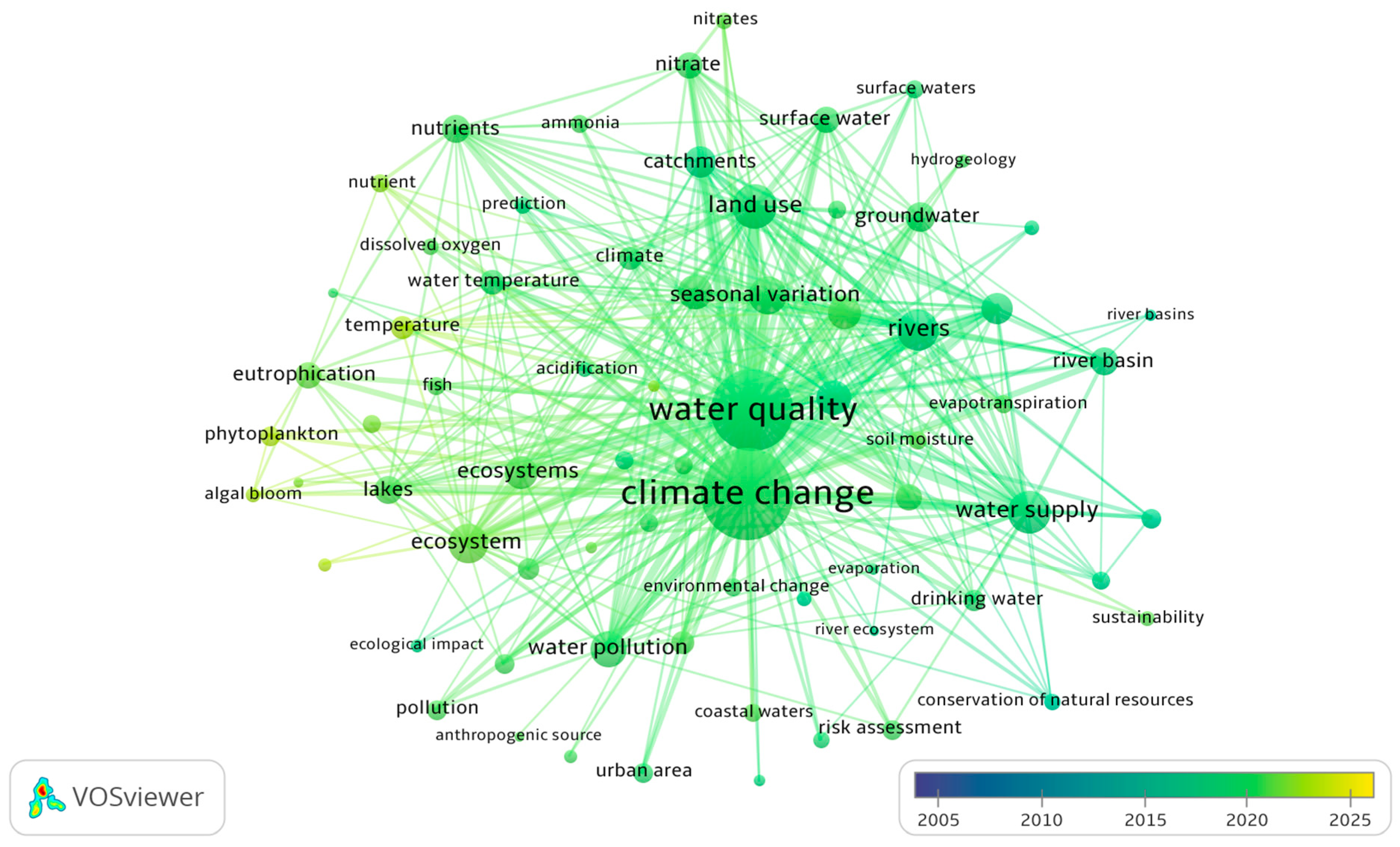 Figure 3, Figure 4 and Figure 5 illustrate the results of bibliometric analysis performed using VOSviewer version 1.6.19. Figure 3 shows the co-occurrence network of keywords related to the impact of climate change on water quality. Each keyword is represented by a circular node, and its size increases proportionally with its relevance and importance in the network. They were grouped into four distinct clusters, represented by red (cluster 1), green (cluster 2), blue (cluster 3), and yellow (cluster 4). A short distance between nodes indicates a closer link between keywords, and the lines drawn between them highlight existing connections. The thickness of the lines reflects the frequency of co-occurrence of the two keywords in publications.
