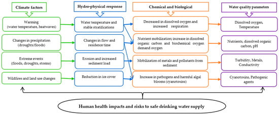 Climate change is one of the most complex and pressing issues of the 21st century, with implications for aquatic ecosystems, freshwater resources, and drinking water treatment and distribution systems, both globally and nationally, and threatens human health, sustainable development, and biodiversity [1,2,3,4]. The consequences of climate change are twofold, affecting both water availability and quality [5,6].