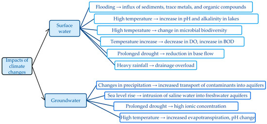 The main chemical indicators of water affected by climate change are temperature, pH, dissolved organic matter, dissolved oxygen, organic and inorganic micropollutants, nutrients, and biological indicators with pathogens (as presented in Figure 6) [7,48].