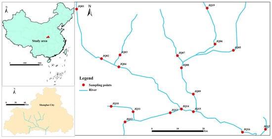 Field campaigns were conducted during three hydrologic windows in 2022—dry season (January), normal season (May), and flood season (August)—with one sampling event per season. Along the Jinqian main stem and its tributaries, 19 stations were established (12 on the trunk, 7 on feeders) and sampled sequentially from headwaters to confluence. Ancillary materials comprised four bulk-rainfall collectors and eight municipal effluent grabs. At each river site, water was withdrawn 0.5 m below the mid-channel surface with a 5-L polyethylene sampler, then transferred to pre-rinsed 2-L HDPE bottles that had been triple-washed with de-ionized water and conditioned three times with on-site river water. Samples were kept in portable coolers at 4 °C, transported to the laboratory, and analyzed within seven days of collection.