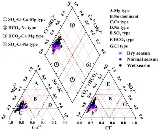 The Piper trilinear diagram classifies the hydrochemical types of river water based on the ionic composition and concentration ratios of the water. As shown in Figure 2, the sample points from all three hydrological periods predominantly fall within the region dominated by HCO3–Ca·Mg type water, indicating that this type is the primary hydrochemical type in the study area. Further analysis of the hydrochemical types using the Schoeller classification method revealed that during the dry season, the water type is mainly HCO3–Ca (accounting for 42.1%), while in the normal and flood seasons, the dominant type is HCO3·SO4–Ca·Mg, with respective proportions of 36.8% and 52.6%. The seasonal variation in hydrochemical types may be related to the increased dissolution of gypsum in the strata due to higher rainfall, as well as the higher evaporation intensity caused by higher temperatures during the flood and normal seasons [18].