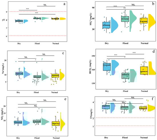 Seasonal variations of hydrochemical parameters in the Jinqian River (a) pH; (b) SO42−; (c) Na+; (d) HCO3−; (e) NO3−; (f) TN. Note: *** denotes a p-value < 0.001, ** denotes a p-value < 0.01, * denotes a p-value < 0.05, NS: Not Significant. In (a,f), the red lines represent the limits set by the Chinese Surface Water Quality Standards (GB3838-2002) [16].