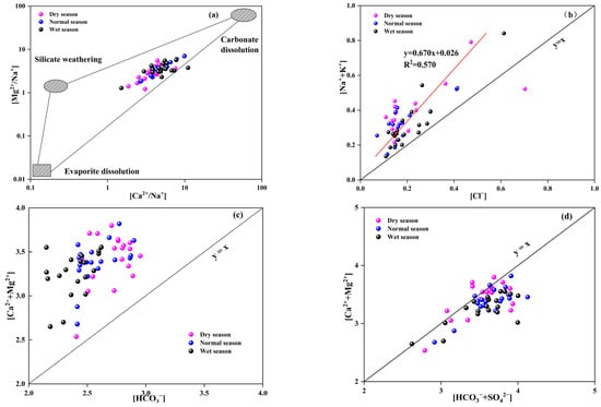 The ion ratio coefficient method is frequently employed to investigate the hydrogeochemical processes of water bodies and the origins of their hydrochemical constituents [22]. The molar ratios of (Ca2+/Na+) and (Mg2+/Na+) are commonly used to distinguish the control of water chemical composition by the weathering and dissolution of carbonate rocks, silicate rocks, and evaporite rocks. Previous studies have shown that the molar concentration ratios of Ca2+/Na+ and Mg2+/Na+ produced by the weathering of silicate rocks are 0.35 ± 0.15 and 0.24 ± 0.12, respectively. For carbonate rock weathering, these ratios are 50 ± 20 and 20 ± 8, and for evaporite rocks, they are 0.17 ± 0.09 and 0.02 ± 0.013 [23]. As shown in Figure 4a, the sample points from the three periods are generally located in the intermediate zone between the weathering dissolution of silicate rocks and carbonate rocks. In combination with the analysis of hydrochemical types mentioned earlier, it is evident that the weathering dissolution of carbonate rocks is the primary source of hydrochemical components in the river water, followed by that of silicate rocks.
