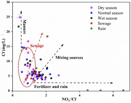 As shown in Figure 5, the rainwater samples (n = 4) exhibited low Cl− concentrations (2.01 mg/L) and high NO3−/Cl−ratios (4.44), whereas the sewage samples (n = 8) had high Cl− concentrations (7.5 mg/L) and low NO3−/Cl− ratios (1.16), which is consistent with previous studies [30]. In the study area, NO3− in the river is likely primarily derived from a mixture of sewage and fertilizer pollution, as evidenced by the relatively high Cl− concentration and moderate to low NO3−/Cl− ratio. The impact of rainfall on nitrogen in the Jinqian River is minimal, given the low NO3− concentration in precipitation (4.60 mg/L). During the flood season, approximately 58% of the samples are close to the fertilizer pollution endmember. This is a typical characteristic of agricultural rivers [31]. While, during the dry season, 50% of the samples are located at the sewage endmember, with the remaining samples positioned at the mixed endmember.