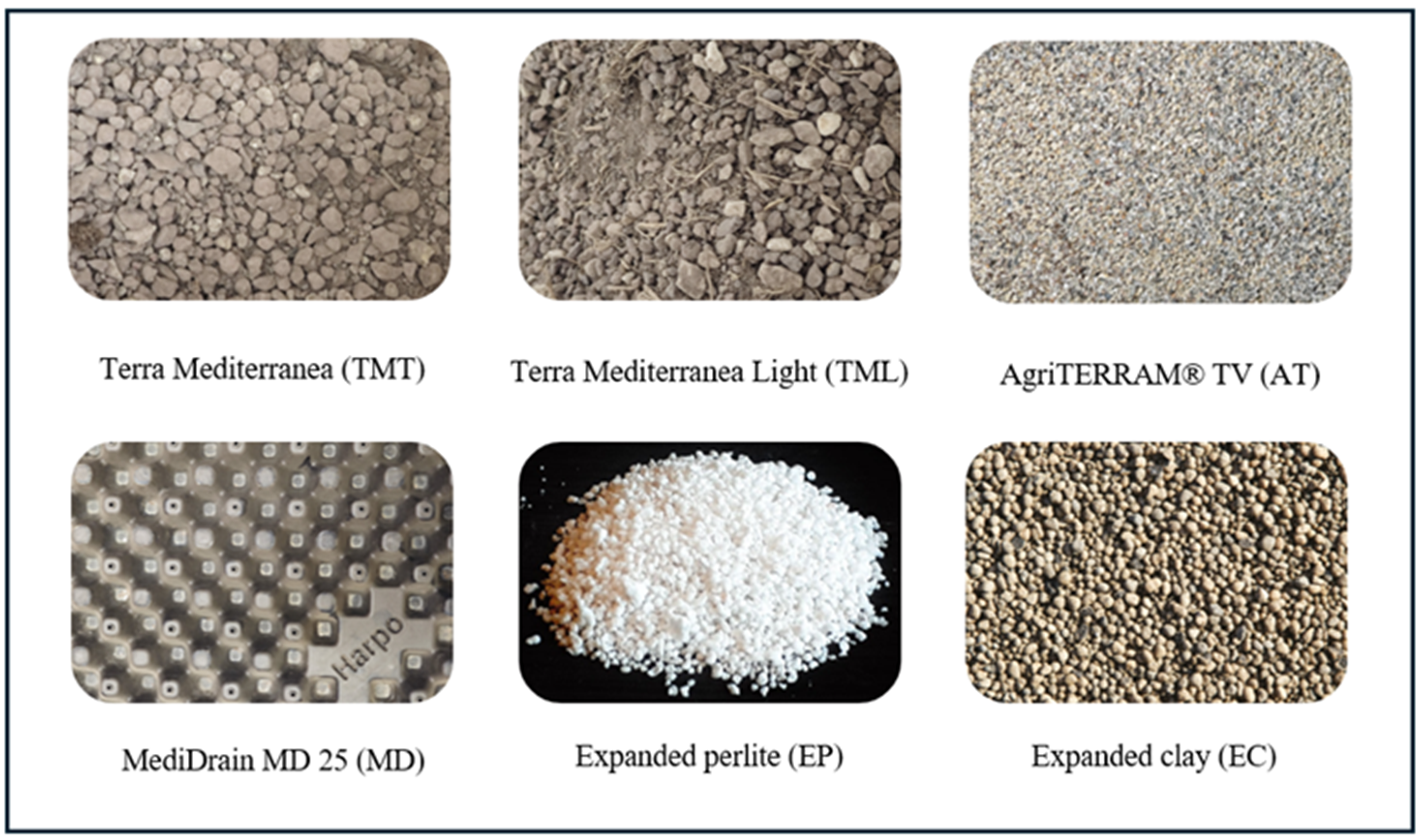 | Substrate | Terra Mediterranea (TMT) | Green compost, peat, lapillus, pumice and zeolite | 0.939 | 0.475 | 0.289 | 0.073 | 50−60 | 6.0−7.8 | 0.05−0.25 |