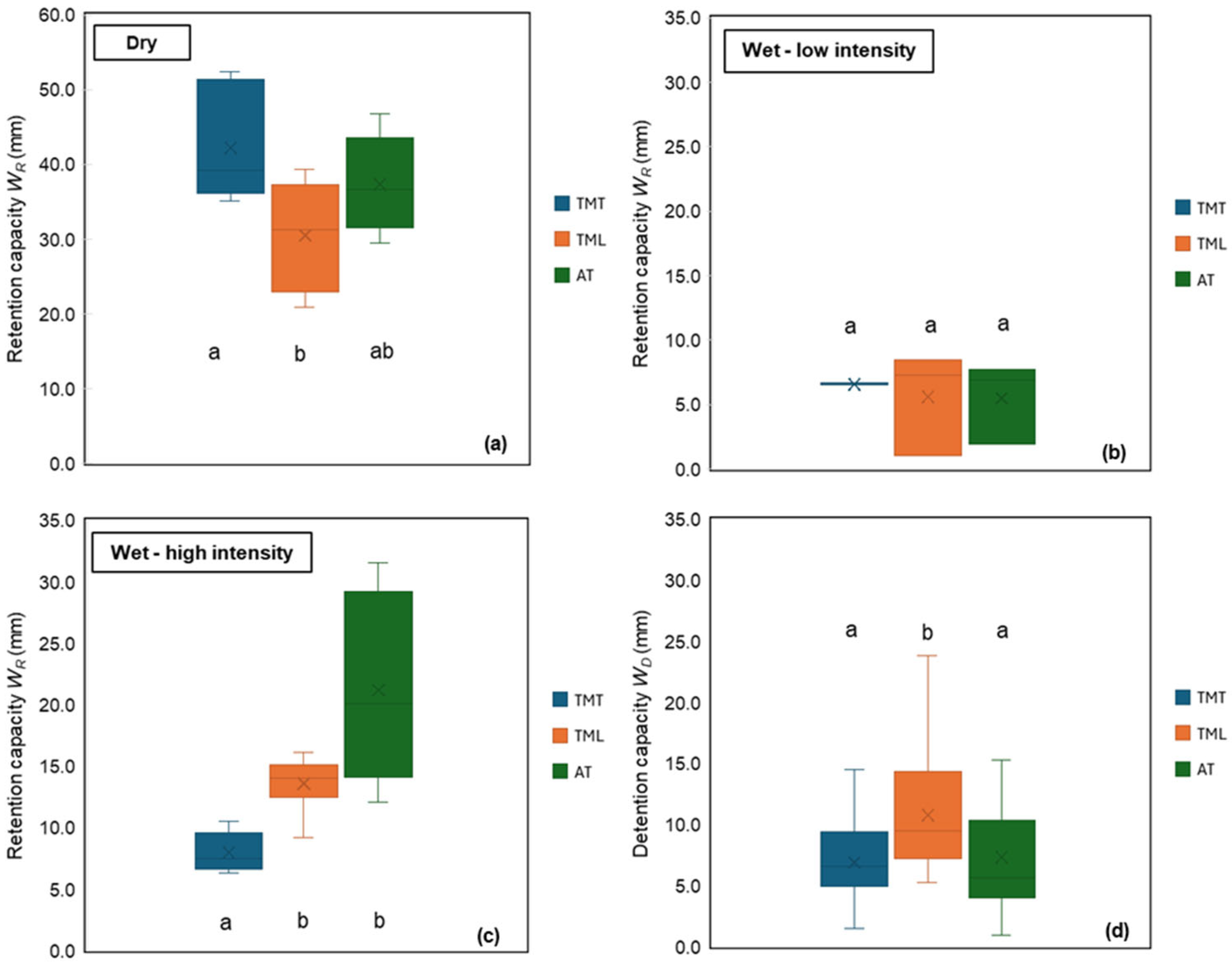 3.2. Statistical Evaluation of the Hydrological Performance of Green Roof Columns