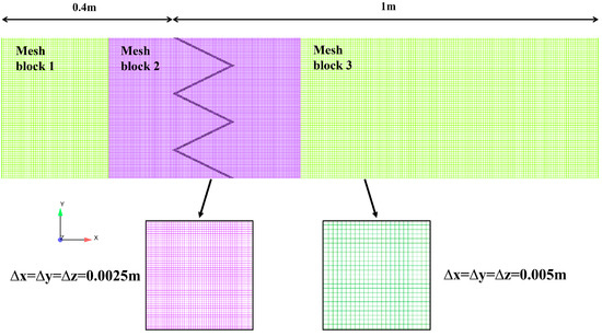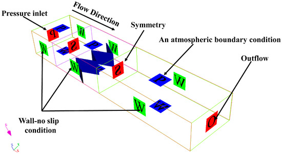 The boundary conditions in this study are set as follows: The inlet boundary is set as a pressure inlet, and the free-surface elevation of the channel inlet section is given, with the head over the weir (H) prescribed in the range of 0.013 m to 0.05 m. The downstream outlet plane adopts a free outflow boundary condition. The lower and two side boundaries are regarded as rigid walls and set as no-slip wall boundaries during the simulation. The upper boundary of the channel is set as an air inlet, and the rest of the boundary conditions are set as symmetric boundary conditions. The boundary condition settings for each mesh block are illustrated in Figure 3 and summarized in Table 2.