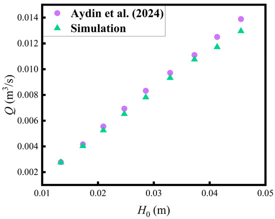 To validate the accuracy of the numerical simulations, the computed discharge coefficients were compared with the experimental data reported by Aydin et al. [31]. For a specific configuration (L/B = 2.33, n = 3), the simulated discharge (Q) under various total head over the weir (H0) was compared with experimental measurements, as illustrated in Figure 4. The results demonstrate excellent agreement, with relative errors ranging from 0.72% to 6.84%, confirming the credibility of the numerical model.
