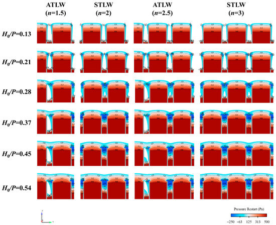 To investigate the flow patterns and pressure distribution under identical cross-sectional conditions, computational fluid dynamics (CFD) analysis was employed to obtain two-dimensional profiles of both ATLWs (n = 1.5, 2.5) and STLWs (n = 2, 3) under various relative headwater conditions (H0/P), as illustrated in Figure 6. The results indicate that at low H0/P values, the flow characteristics of ATLWs and STLWs are identical, both exhibiting fully symmetrical clinging nappe flow. The water smoothly passes over the weir crest, with the nappe closely adhering to the downstream face. No nappe interference or local submergence is observed between adjacent cycles, indicating a stable flow state, high discharge efficiency, and a maximum discharge coefficient. As H0/P increases, all chambers of the STLW become fully submerged. In contrast, the ATLW exhibits a fully aerated nappe and develops a large cavity between cross-sections Y1 and Y2. These cavities exhibit similar irregular and closed shapes, while the flow in the remaining chambers resembles that of the STLW, being fully submerged. This flow behavior is attributed to the asymmetric geometry of the ATLW and the resulting mainstream deflection caused by sidewall confinement. With a further increase in H0/P, the cavities in the STLW persist, and their size remains largely constant. Specifically, when H0/P ranges from 0.13 to 0.21, both ATLWs and STLWs exhibit clinging nappe flow with identical characteristics. When H0/P increases to 0.37, the STLW becomes fully submerged, whereas a distinct cavity forms between sections Y1 and Y2 in the ATLW. As H0/P further rises to 0.54, this cavity persists and its size stabilizes.