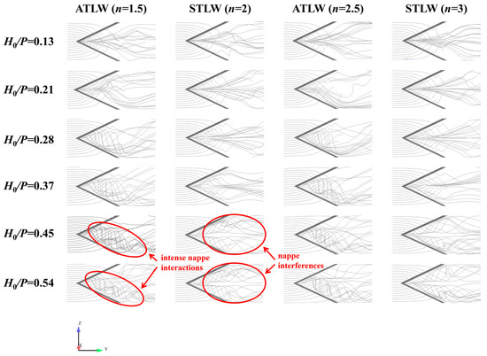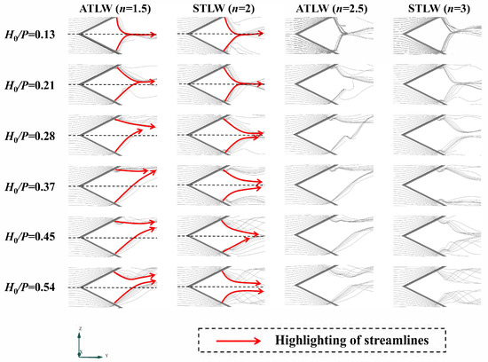 Streamlines near the weir crest (z/P = 1) in both ATLWs and STLWs under various flow and geometric conditions (L/B = 2.33).