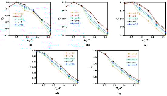 Further analysis of the effect of cycle number n reveals that at lower H0/P, the Cd values for both ATLWs and STLWs are essentially identical across different L/B conditions. As H0/P increases beyond a certain threshold, significant differences begin to emerge between the Cd values of ATLWs and STLWs. The reason for this is that at low heads, the interference between outflows from individual cycles is weak, and no flow blockage occurs, whereas with increasing H0/P, localized flow blockage gradually develops near the weir crest, leading to the divergence in discharge coefficients. Taking L/B = 1.37 as an example, the Cd values for ATLWs and STLWs are consistent at H0/P of 0.13 and 0.21; a noticeable difference appears when H0/P increases to 0.37. Under identical H0/P conditions, the Cd of the STLWs is generally higher than that of the ATLWs. When H0/P = 0.52, the Cd of STLWs increases by approximately 5.4% to 14.3% compared with that of ATLWs. Regarding the cycle number effect, the Cd values for n = 2 and n = 3 are similar in STLWs, whereas in ATLWs, influenced by their asymmetric structure, Cd shows an increasing trend with the increase in n.