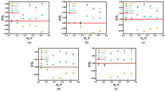 Variation in the flow magnification ratio (Q/Qn) with the relative headwater (H0/P) for ATLWs and STLWs with different cycle numbers (reference: ATLW, n= 2.5) under various relative crest length conditions: (a) L/B = 1.37; (b) L/B = 1.50; (c) L/B = 1.67; (d) L/B = 2.33; (e) L/B = 2.88.