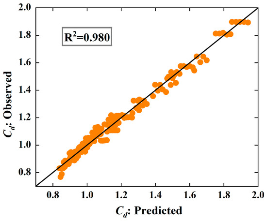 To quantitatively assess the influence of geometric parameters and hydraulic conditions on the discharge capacity of ATLWs and STLWs, this study developed an empirical formula for estimating the discharge coefficient (Cd). The formula was derived based on the following parameter ranges: sidewall angle (α) from 20° to 47°, relative crest length (L/B) from 1.37 to 2.88, relative headwater (H0/P) from 0.13 to 0.55, and cycle number (n) from 1.5 to 3.5. As listed in Table 4, the empirical formula (Equation (13)) demonstrates excellent fitting performance, with a coefficient of determination (R2) as high as 0.980. In addition to R2, multiple statistical metrics, including the Root Mean Square Error (RMSE), Mean Square Error (MSE), and Mean Absolute Error (MAE), were employed to comprehensively evaluate the formula’s predictive accuracy, reliability, and stability. A comparison between the predicted and observed values is shown in Figure 11. The results indicate that the empirical formula possesses satisfactory predictive capability, and the predicted values agree well with the observed data. The maximum relative error for all data points does not exceed 10%, and the average relative error is 2.64%.