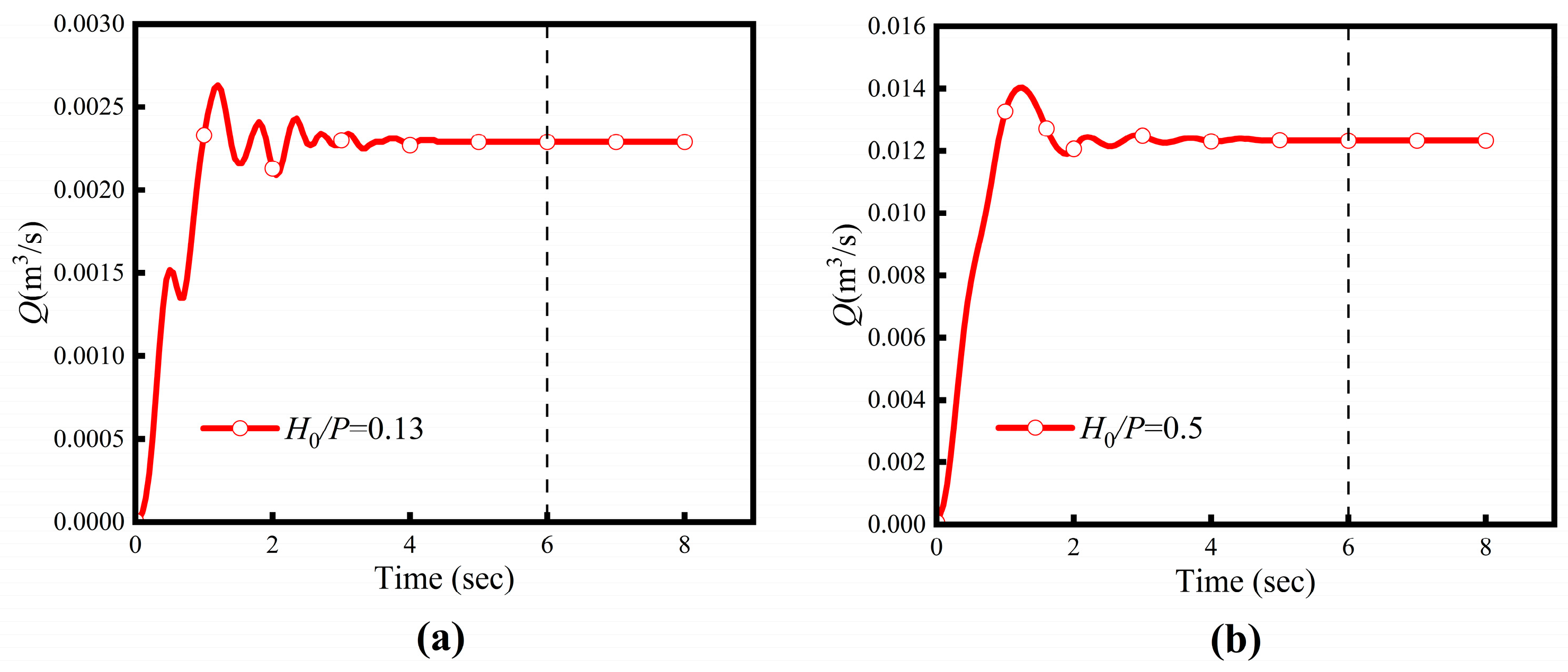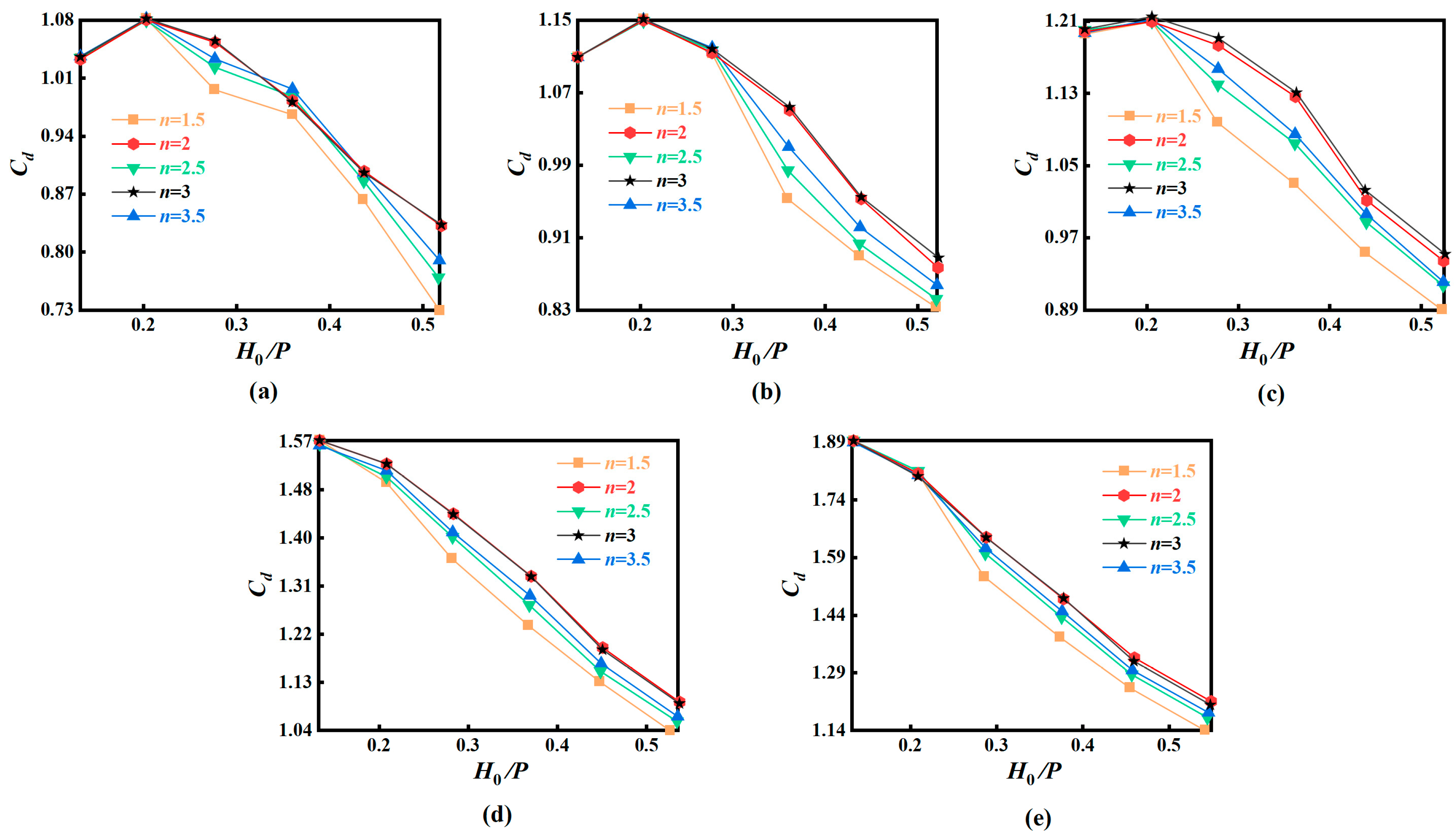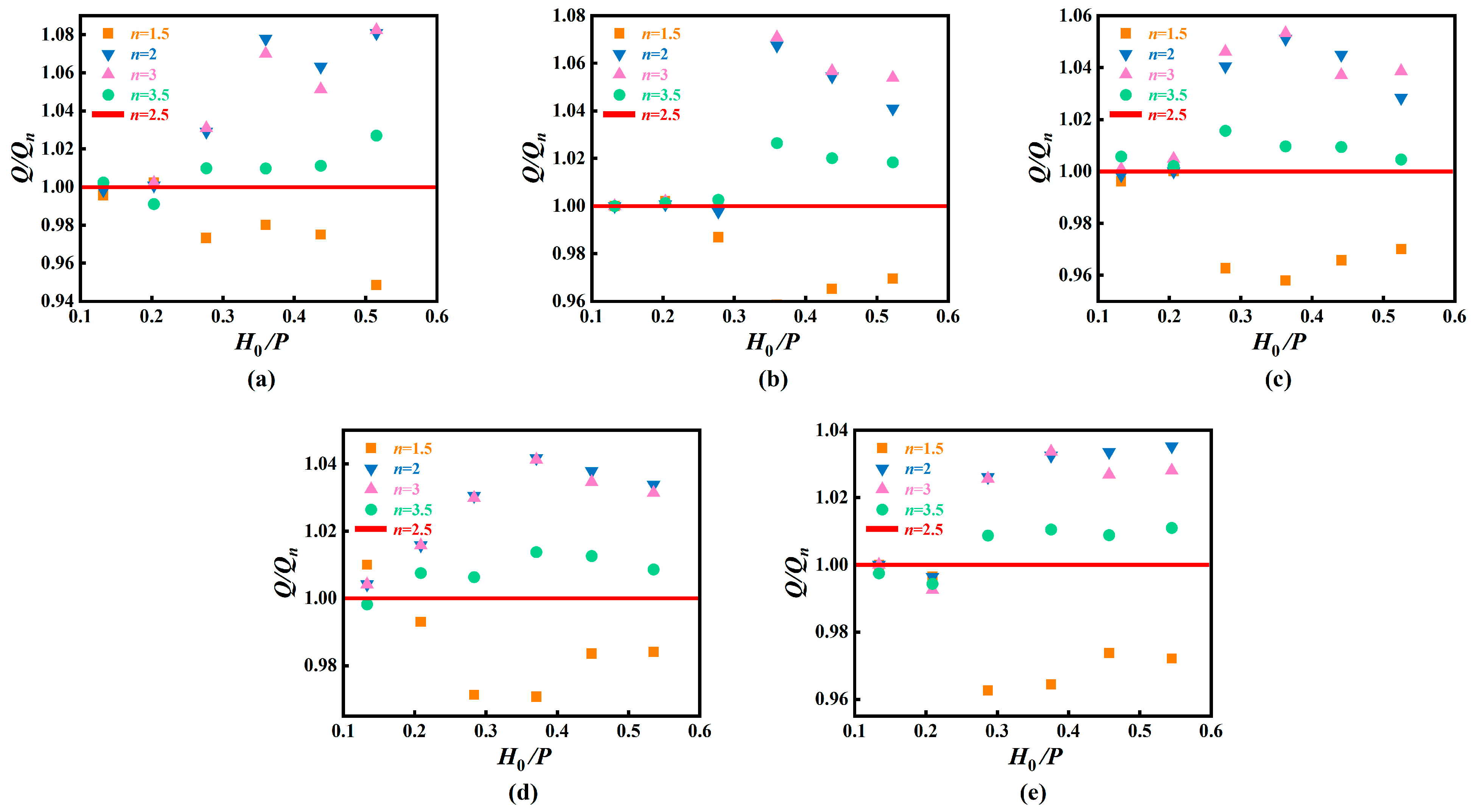 - At lower H0/P ratios, the Cd and Q/Qn of ATLWs and STLWs are essentially identical, indicating that the asymmetric design can achieve flow conveyance efficiency comparable to that of the symmetric weir under low-headwater conditions. However, as H0/P increases, the Cd and Q/Qn of ATLWs are generally lower than those of STLWs under the same conditions, due to the increased energy dissipation caused by cavity formation, streamline deflection, and more intense nappe disturbances in ATLWs. Furthermore, in ATLWs, an increase in the cycle number (n) can significantly enhance the flow capacity, whereas this effect is not pronounced in STLWs.