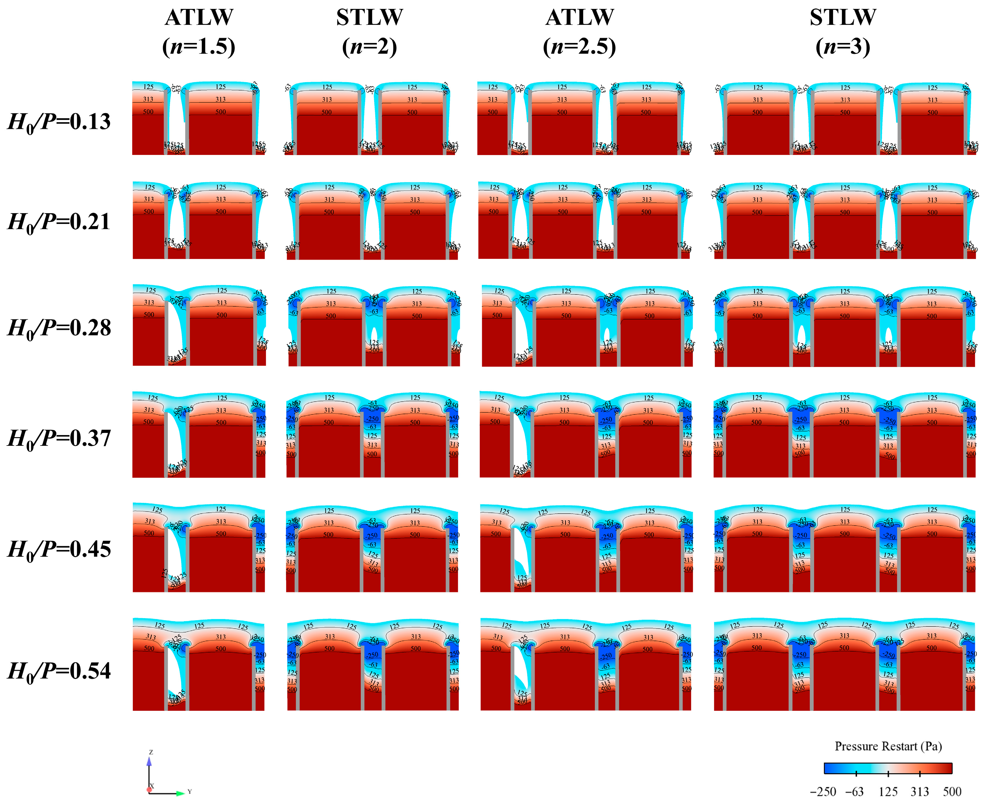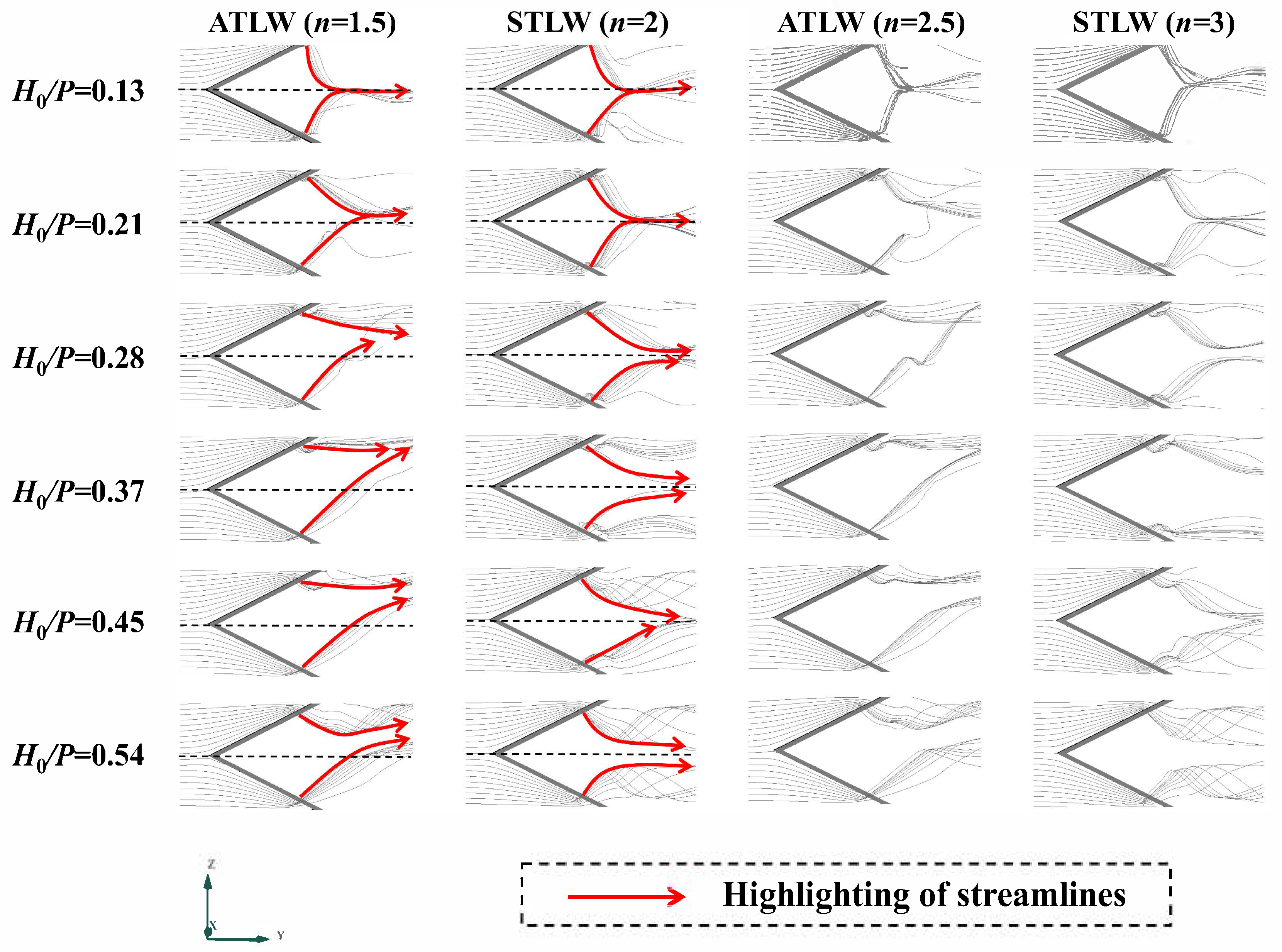 - Streamline visualization systematically reveals fundamental differences in the flow structures between ATLWs and STLWs. At low H0/P ratios, the lower-layer streamlines of both configurations show no deflection, the upper-layer streamlines exhibit minimal disorder, and their flow patterns are similar. As H0/P increases, distinct differences emerge: the lower-layer streamlines in STLWs maintain their original trend, while the upper-layer streamlines, despite increased disorder, remain relatively organized. In contrast, ATLWs exhibit significant and persistent deflection in the lower-layer streamlines, directly contributing to cavity formation. Their upper-layer streamlines demonstrate intense disturbances not observed in STLWs, which are directly associated with the unique nappe interference induced by the asymmetric geometry.