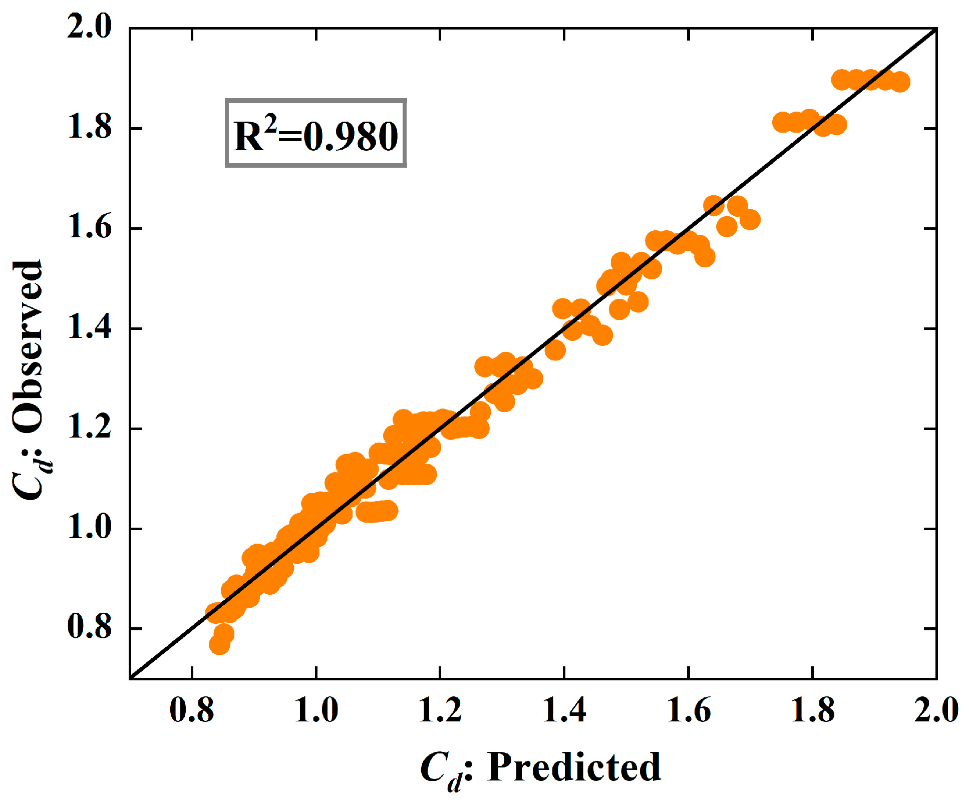 - Based on an extensive parameter range, this study derived a generalized empirical formula for predicting the discharge coefficient (Cd) of triangular labyrinth weirs. This formula demonstrates exceptionally high goodness-of-fit (R2 = 0.980) and low prediction error (mean relative error of 2.64%), providing a practical and reliable quantitative basis for the hydraulic design and performance optimization of ATLWs in complex environments.