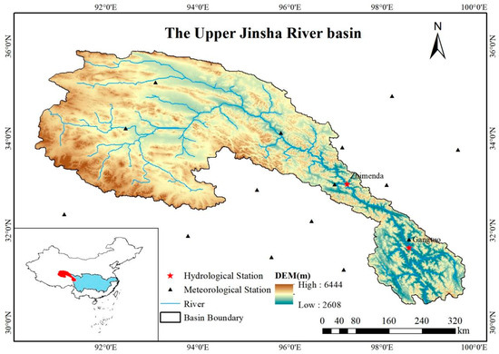 The Jinsha River originates in the plateau region, spanning Qinghai Province, the Tibet Autonomous Region, Sichuan, and Yunnan Province. It is an important part of the Upper Yangtze River. The section above the Zhimenda Station is considered the source region of the Yangtze River. The main river channel stretches approximately 1120 km from this source to Zhimenda Station and extends another 283 km downstream to Gangtuo Station. The catchment areas controlled by Zhimenda and Gangtuo Stations are 157,000 km2 and 161,000 km2, respectively. This study focuses on the Jinsha River upstream of Gangtuo Station, shown in Figure 1. The region is characterized by rugged topography and deeply incised valleys, forming a typical alpine–gorge landscape. The basin exhibits a typical plateau climate with distinct vertical zonation. The mean annual temperature decreases markedly with increasing elevation, ranging from −4.8 °C to 14.82 °C, while average annual precipitation varies spatially from approximately 228 mm to 953 mm, generally increasing from the northwest to the southeast [32]. Its hydrology is dominated by the monsoon, with approximately 70% of the annual precipitation concentrated from June to September. This results in a strongly seasonal regime with high flows in summer and low flows in winter [33]. As an alpine region, the basin’s runoff is driven by multiple processes: glacial melt, snowmelt, seasonal frozen ground dynamics, and rainfall. The contribution of these components exhibits significant interannual and intra-annual variations, governed by their spatiotemporal distribution, climatic conditions, and cryospheric evolution [34,35]. Consequently, river runoff is primarily supplied by precipitation and meltwater from glaciers and seasonal snowpack.