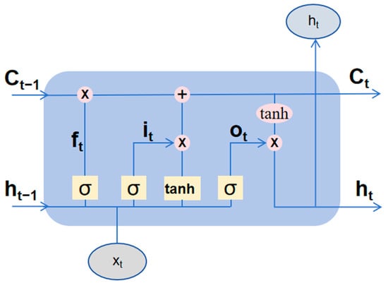 is the input vector at time step t, is the hidden state at time step t, is the cell state at time step t, and represents the candidate cell state. The symbols , , and denote the forget gate, input gate, and output gate, respectively. and U are the weight matrices, while b denotes the bias term. is a Sigmoid function, and is the hyperbolic tangent function. is the element-wise multiplication (Hadamard product).