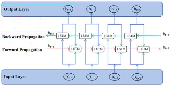 BiLSTM is a further extension of LSTM. [41]. Unlike unidirectional LSTMs which rely solely on historical information, BiLSTMs incorporate a reverse-processed LSTM layer to simultaneously utilize both past and future contextual information within a sequence. This enables a more comprehensive capture of bidirectional dependencies within the sequence. This bidirectional propagation structure endows BiLSTMs with greater expressive power in time-series modeling, particularly in capturing complex temporal dependencies. Compared to unidirectional LSTMs, BiLSTMs demonstrate superior accuracy [42]. The BiLSTM network architecture is illustrated in Figure 3, comprising three principal components: the input layer, the bidirectional LSTM layer, and the output layer [43]. At the input layer, the input vector for each time step is denoted as xt. BiLSTM simultaneously performs forward (past → future) and backward (future → past) information propagation and state updates on the time series, thereby capturing the bidirectional dependencies within the sequence more comprehensively. The forward LSTM handles the forward dependencies of the input sequence, while the backward LSTM captures the reverse dependencies. The bidirectional output at each time step is jointly determined by the hidden states of both the forward and backward LSTMs, as depicted in the calculation process shown in the equations below.
