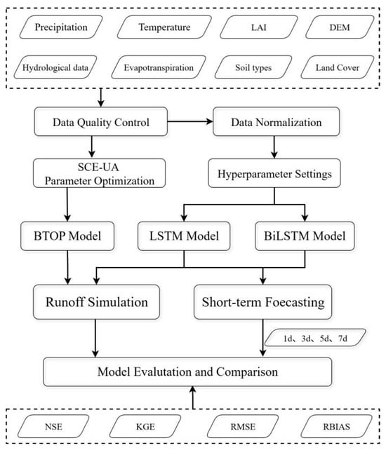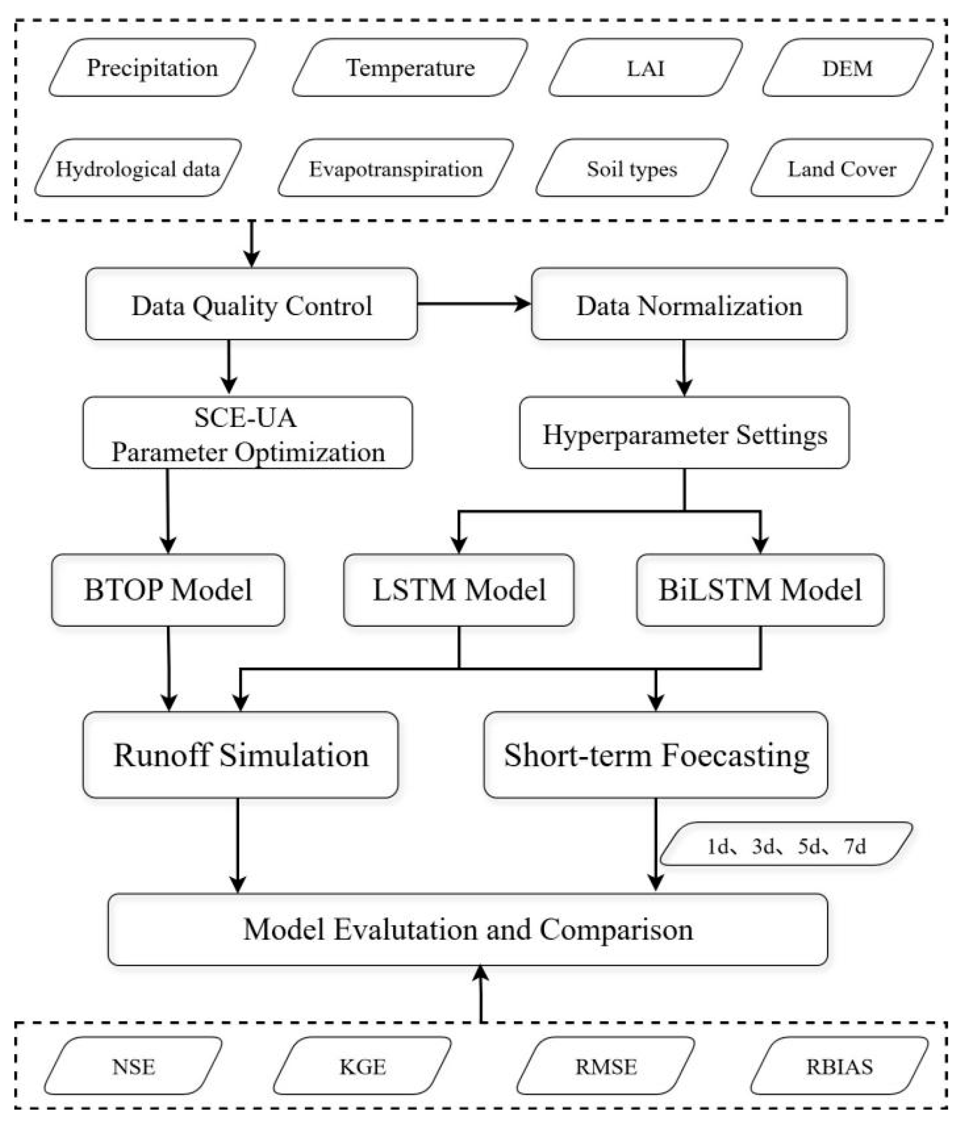In this study, we first used the collected dataset to construct three distinct models: the physics-based BTOP model, and the data-driven LSTM and BiLSTM models. Model parameters were optimized accordingly: the BTOP model’s parameters were calibrated using the SCE-UA algorithm, while the optimal architectures and hyperparameters for the LSTM and BiLSTM models were identified via tuning and validation on a separate dataset. Subsequently, all three models were used to conduct runoff simulations, and their results were compared to evaluate their respective applicability for short-term forecasting within the study area. Finally, multi-step short-term forecasting was performed using the LSTM and BiLSTM models for forecast periods of 1 d, 3 d, 5 d, and 7 d to systematically analyze their forecasting capabilities and error propagation characteristics at different horizons.