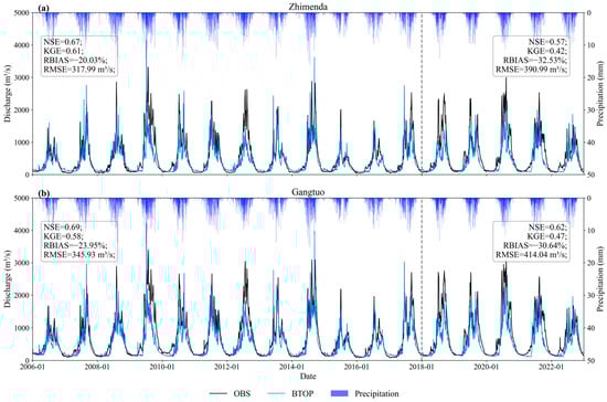 Simulated and observed hydrographs of BTOP model (a) simulated and observed hydrograph of the BTOP model at Zhimenda station; (b) simulated and observed hydrograph of the BTOP model at Gangtuo station.