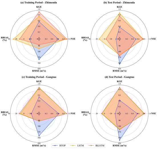 Radar diagram of model performance comparison. (a) radar diagram of Zhimenda station during training period; (b) radar diagram of Zhimenda station during test period; (c) radar diagram of Gangtuo station during training period; (d) radar diagram of Gangtuo station during test period.