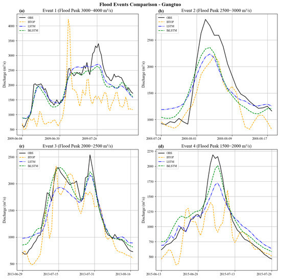Event 1 (Flood Peak 3000–4000 m3/s), as shown in Figure 8a: The BTOP model severely misrepresented both the magnitude and timing of the peak. In contrast, both LSTM and BiLSTM models effectively captured the overall flood process, including the timing of the main peak and the characteristics of preceding smaller peaks, although they significantly underestimated the ultimate peak magnitude.