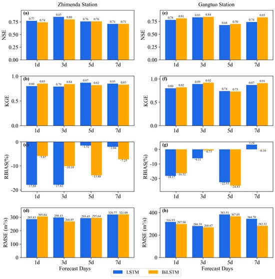 At Gangtuo Station, a different pattern emerged. The LSTM model performed best at the 3 d forecast period (NSE = 0.83, KGE = 0.89) but suffered a marked decline at 5 d (NSE = 0.68, RBIAS = −22.53%). In contrast, BiLSTM demonstrated greater robustness, maintaining high accuracy (NSE = 0.83, KGE = 0.91, RBIAS ≈ 0) even at the 7 d forecast period. This highlights BiLSTM’s superior capability for longer-term forecasts at Gangtuo.