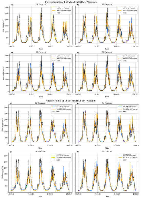 Both the LSTM and BiLSTM models effectively captured the characteristic peak–trough dynamics and seasonal patterns in the daily runoff forecasts across the 1 d to 7 d forecast periods at Zhimenda and Gangtuo Stations (Figure 10).