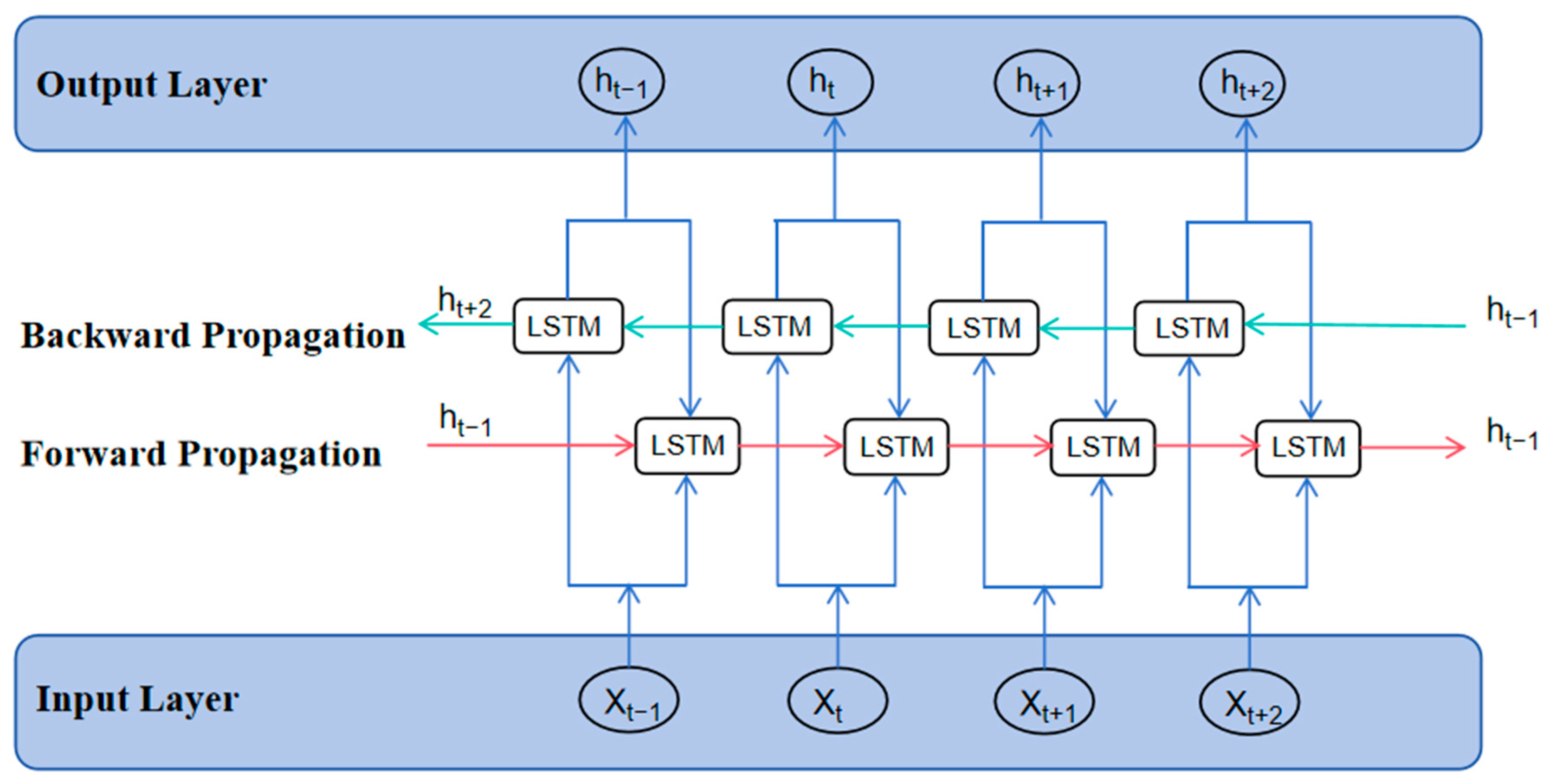 41]. Unlike unidirectional LSTMs which rely solely on historical information, BiLSTMs incorporate a reverse-processed LSTM layer to simultaneously utilize both past and future contextual information within a sequence. This enables a more comprehensive capture of bidirectional dependencies within the sequence. This bidirectional propagation structure endows BiLSTMs with greater expressive power in time-series modeling, particularly in capturing complex temporal dependencies. Compared to unidirectional LSTMs, BiLSTMs demonstrate superior accuracy [