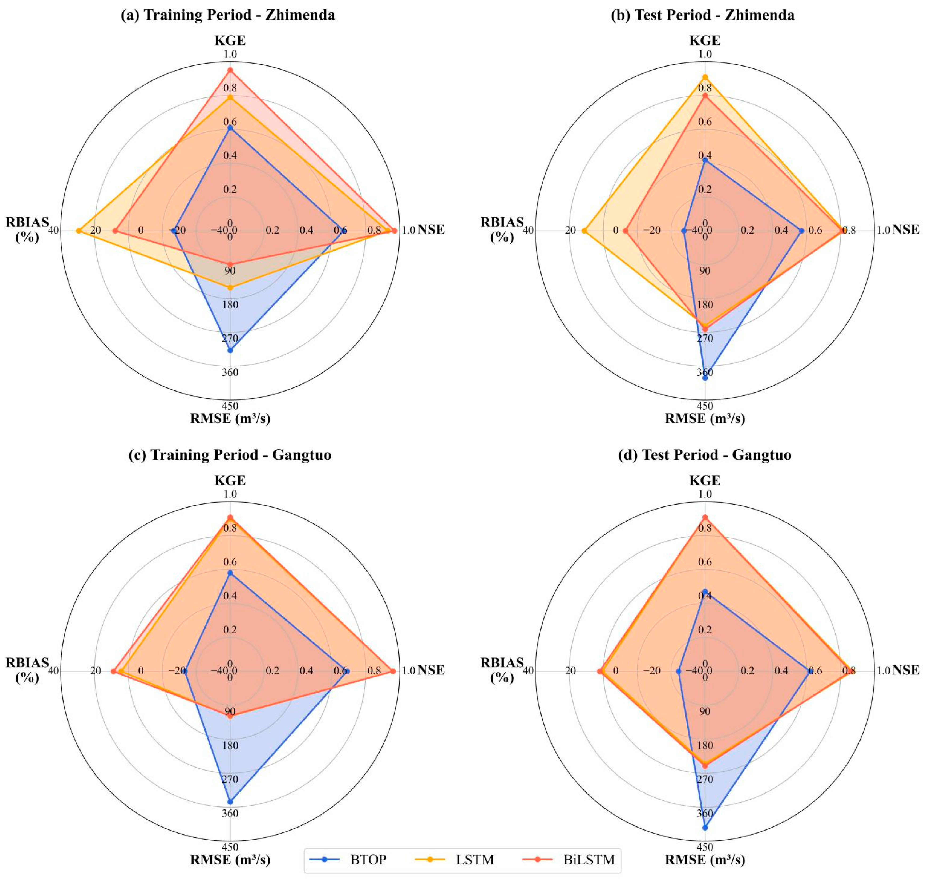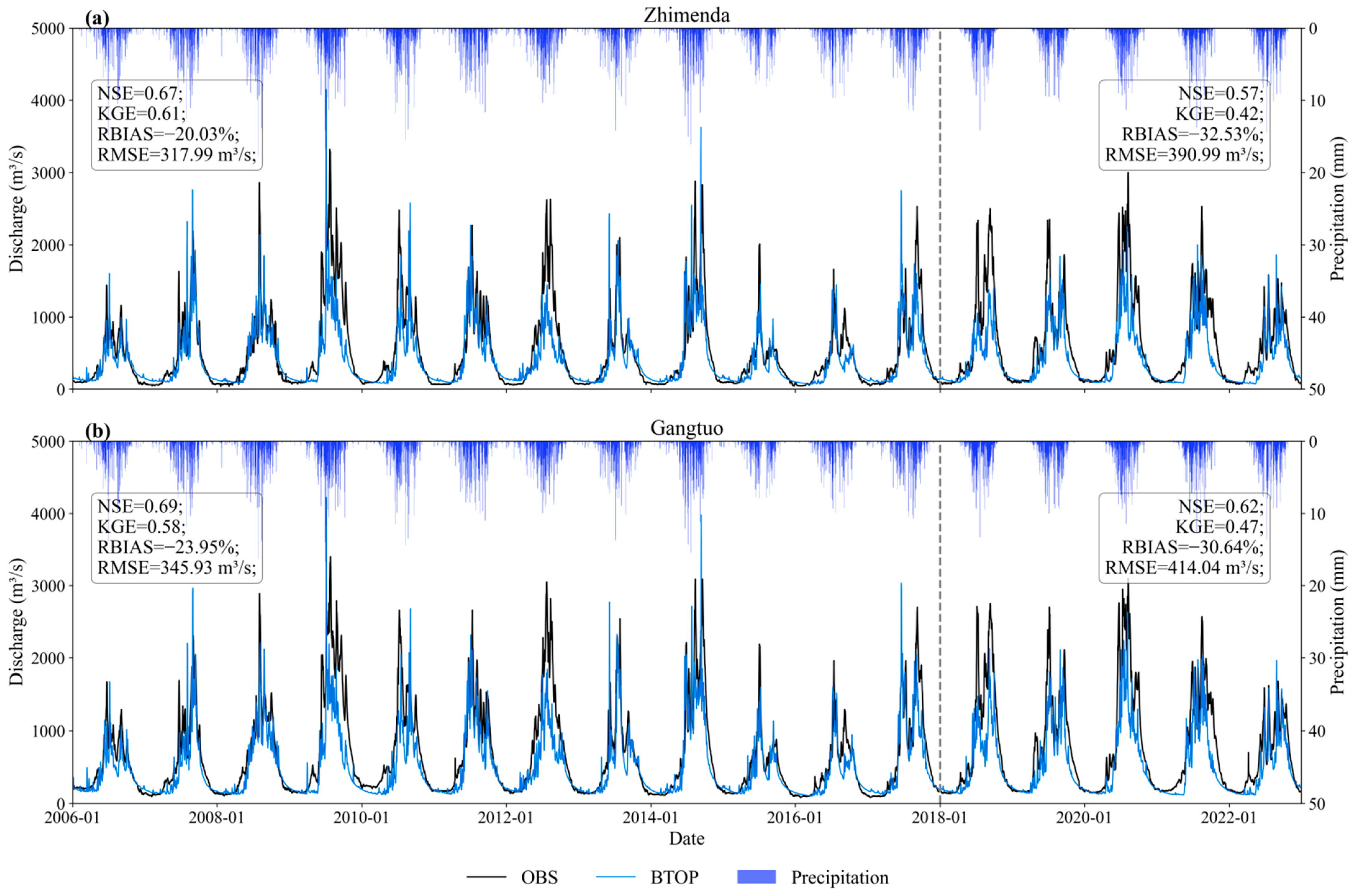 3/s. During test period, its KGE of 0.80 was 0.38 higher than BTOP’s 0.42, indicating a better representation of hydrological processes. An analysis of the RBIAS metric reveals a pronounced negative bias in the BTOP model at both stations and across all periods. During the training period, biases were −20.83% at Zhimenda and −23.35% at Gangtuo, which further widened during test period, confirming a persistent systematic underestimation.