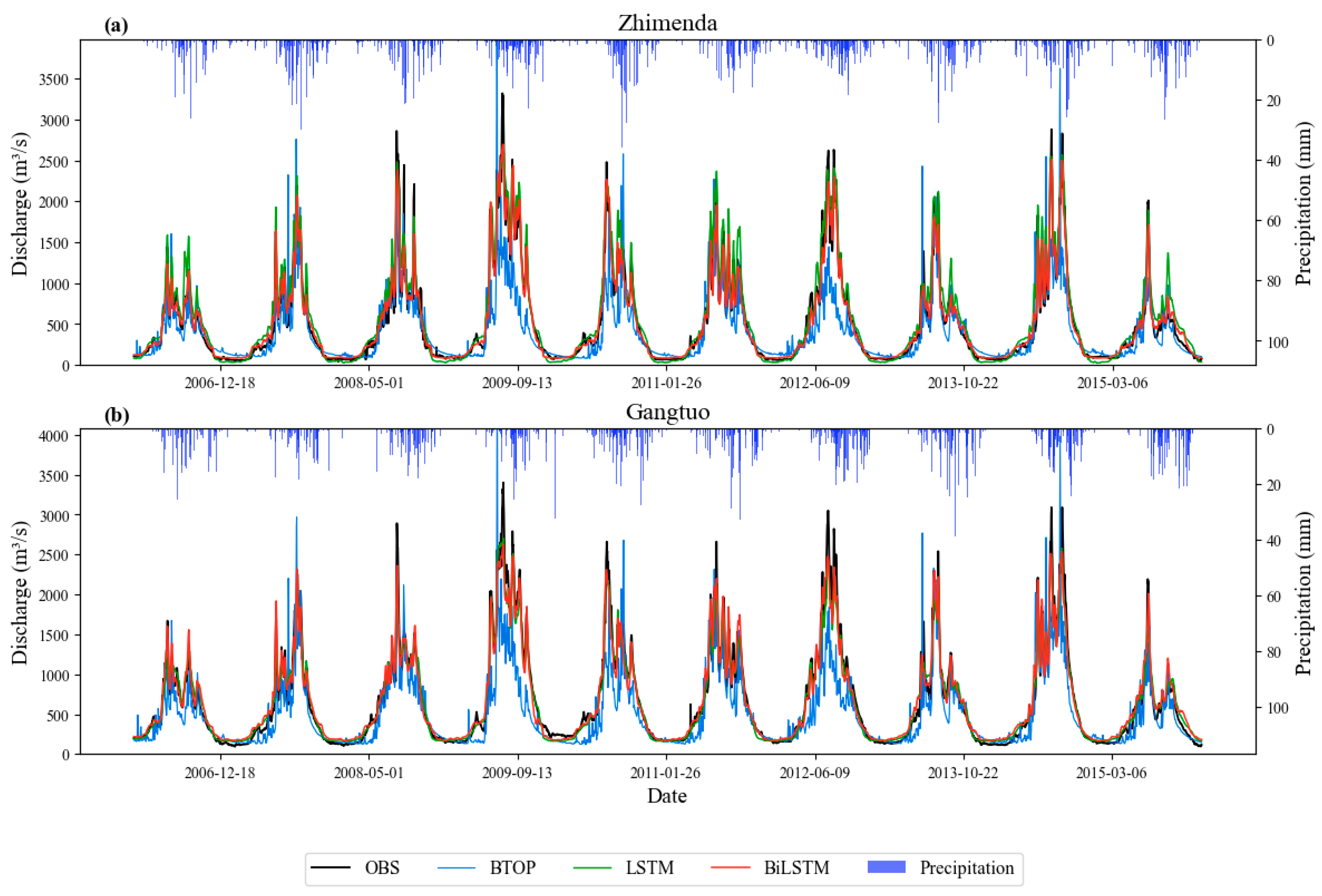 In daily-scale runoff simulation, the BTOP model demonstrated limitations in performance, constrained by input data quality and simplified representations of complex cryospheric processes. During the validation period, the NSE values for Zhimenda and Gangtuo stations were 0.57 and 0.62, respectively (calibration: 0.67 and 0.69). In contrast, the LSTM and BiLSTM models, with their superior ability to capture temporal dependencies and nonlinear relationships, achieved a higher overall accuracy in reproducing runoff processes. During the test period, they maintained high precision, with NSE values of 0.82 and 0.81 at Zhimenda Station, and 0.87 and 0.86 at Gangtuo Station.