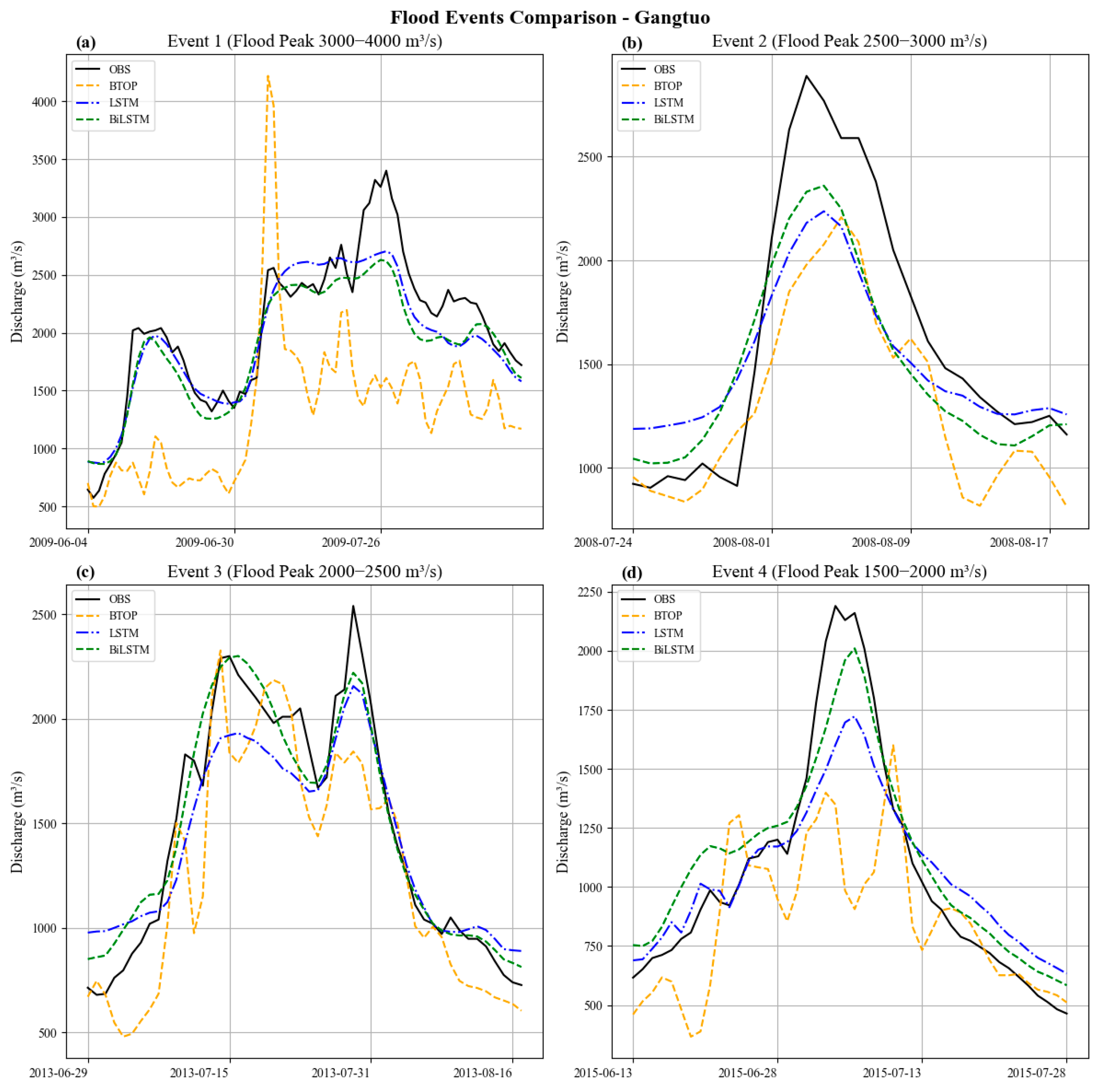 Figure 8) reveal marked differences in the models’ abilities to reproduce flood hydrographs at Gangtuo Station.
