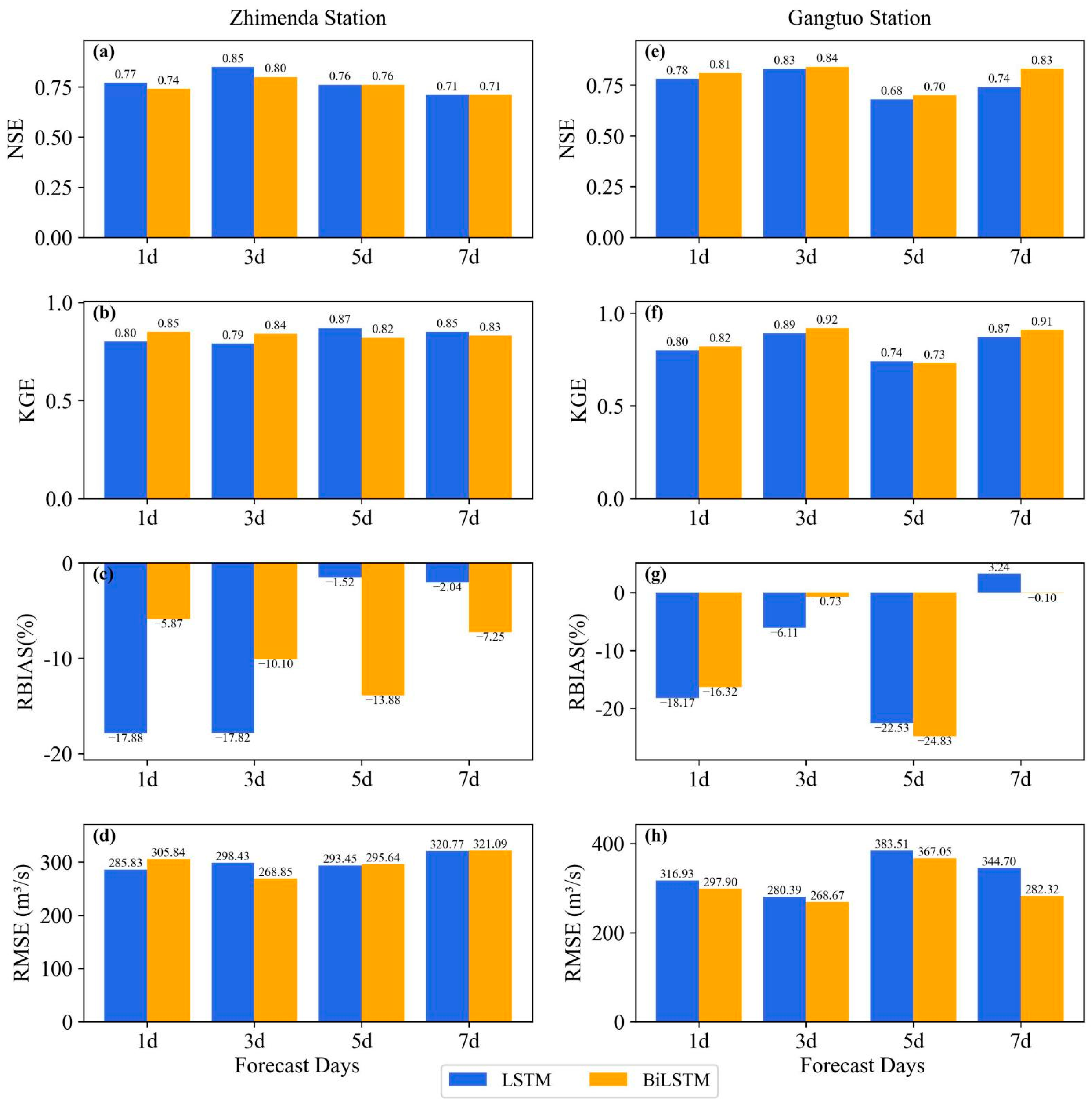 BiLSTM excels at Gangtuo Station, particularly for 3–7-day forecasts, outperforming LSTM in NSE, KGE, and bias control, demonstrating greater robustness.