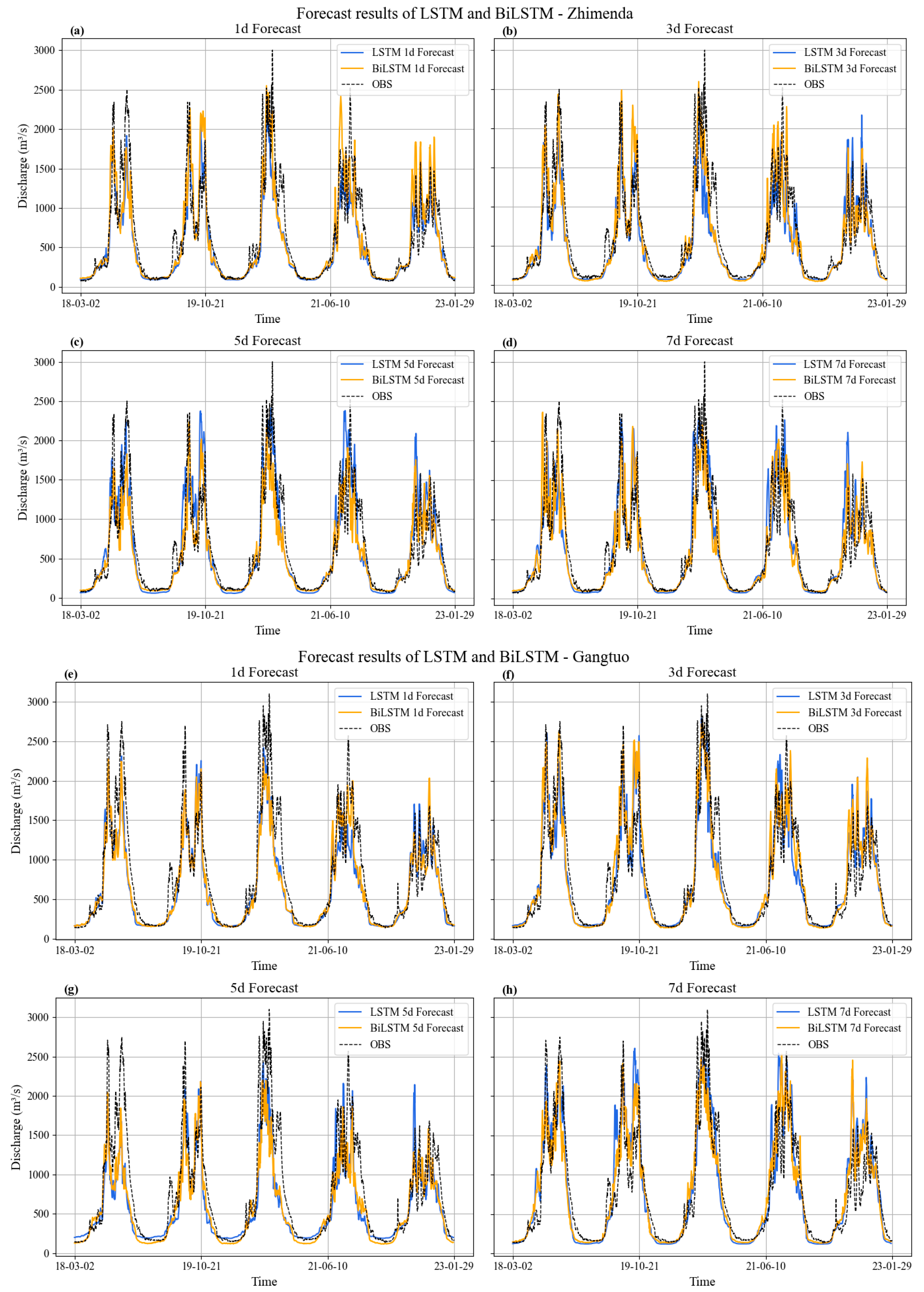 Figure 10b, the LSTM model exhibited a marked underestimation of the drawdown phase relative to the observed data; at the 5 d forecast period, the BiLSTM model demonstrated a more rapid decline in the drawdown phase. For the 2022 flood peak, model results varied considerably across the four forecast periods. At the 1 d forecast period, the BiLSTM model significantly overestimated the flood peak magnitude, whereas the LSTM model exhibited more pronounced overestimation at the 3 d, 5 d, and 7 d forecast periods.