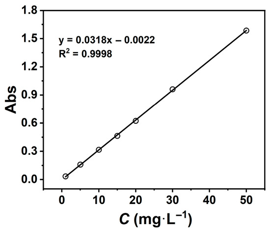A stock solution (1000 mg·L−1) of TCH was prepared by dissolving 500 mg of TCH in deionised water and diluting to 500 mL. The stock was subsequently diluted to prepare standard solutions at 1, 5, 10, 15, 20, 30, and 50 mg·L−1. Absorbance measurements were conducted using a UV-Vis spectrophotometer (λ = 357 nm), and the calibration curve was fitted with Origin software. This yielded a linear regression equation (y = 0.0318x − 0.0022, R2 = 0.9998), demonstrating excellent linearity over the concentration range (Figure 1).