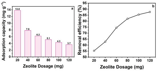 (a) Effect of zeolite dosage on adsorption capacity; (b) Effect of zeolite dosage on removal efficiency. (CTCH = 10 mg·L−1, t = 60 min, pH = 7).