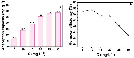 The initial concentration of tetracycline hydrochloride (TCH) influences the mass transfer driving force and final removal efficiency. To investigate this effect, zeolite adsorption performance was systematically studied under different initial TCH concentrations (Figure 3). Figure 3a shows that with constant zeolite dose, contact time, and temperature, adsorption capacity was highly dependent on initial concentration. The adsorption capacity increased from 5 to 20 mg·L−1 but plateaued at higher concentrations. This suggests that elevated concentrations enhance mass transfer, promoting TCH diffusion into zeolite pores. However, once the available adsorption sites on the surface and within the pore channels were saturated, further adsorption capacity increases were limited, demonstrating typical saturation behaviour. Figure 3b reveals that removal efficiency declined from 55.3% to 38.0% as the initial concentration increased from 10 to 30 mg·L−1. This decline is attributed to the fixed zeolite dosage: higher TCH concentrations increase the quantity of molecules available for adsorption, but the limited active sites become progressively occupied, reducing overall removal efficiency.