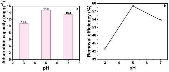 (a) Effect of pH on the adsorption capacity; (b) Effect of pH on the removal efficiency. (CTCH = 10 mg·L−1, mz = 20 mg, t = 60 min).