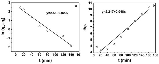 (a) Pseudo-first-order kinetic fitting curve; (b) Pseudo-second-order kinetic fitting curve.