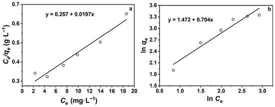 (a) Langmuir model adsorption isotherm fitting curve; (b) Freundlich model adsorption isotherm fitting curve.