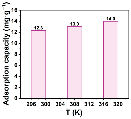 Effect of temperature on the adsorption capacity. (CTCH = 10 mg·L−1, mz = 20 mg, t = 60 min, pH = 7).