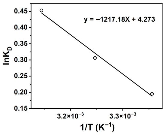 Thermodynamic experiments were conducted at 298, 308, and 318 K. The distribution coefficient (KD) was calculated to determine Gibbs free energy (ΔG), enthalpy (ΔH), and entropy (ΔS) changes according to the following Equations (5)–(7):