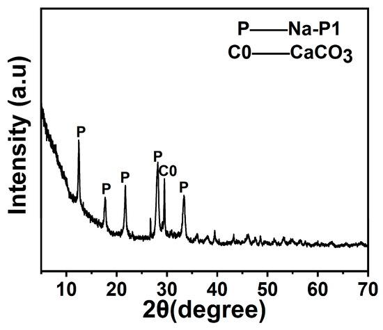 The phase composition and microstructure of the synthesised Na-P1 zeolite were systematically characterised using XRD and SEM. As demonstrated in Figure 10, the XRD pattern exhibited distinct diffraction peaks at 2θ = 13.2°, 23.1°, 26.0°, 30.9°, 31.9°, 34.1°, and 35.6°, matching the standard Na-P1 zeolite reference (PDF#39-0219). These results confirm the successful synthesis of Na-P1 zeolite under the applied hydrothermal conditions. Weak-to-moderate intensity reflections at 2θ = 29.4° and 36.0° were attributed to calcite (CaCO3, PDF#05-0586). This finding indicates the presence of minor CaCO3 residues [32]. These residues likely originated from unreacted calcium species in raw fly ash or precipitation byproducts during synthesis. The Na-P1 phase showed strong reflections in the low-angle region (10–35°), indicating high crystallinity and ordered structure. The sharp decline in signal intensity at higher angles (40–80°) aligns with typical zeolite crystallographic characteristics.