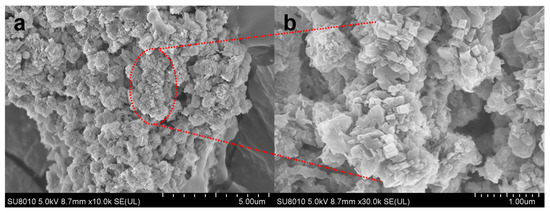(a) SEM characterization of Na-P1 zeolite; (b) Magnified view of the selected region.