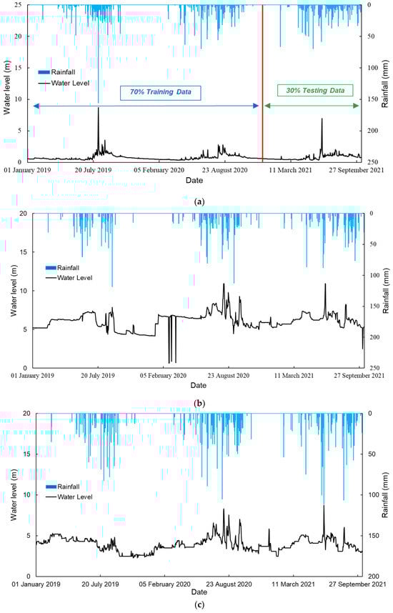 Maximum rainfall outliers and minimum/maximum water level outliers for the selected stations were identified using the unsupervised Isolation Forest algorithm and the supervised XGBoost algorithm, as described in the previous section. The threshold values that distinguish the normal from abnormal data in unsupervised approach were based on contamination levels specified for each station, while in the supervised approach, they were computed using the equations as elaborated in Section 3.3.1. In the supervised learning process, 70% of the time series data were used to train the XGBoost model, and the remaining 30% were reserved for testing (as illustrated in Figure 2a).