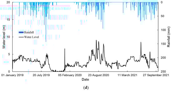 In this study, daily rainfall and water level data from the four selected stations within the Nam Ngum River Basin are employed to train and validate the machine learning models adopted in outlier detection. The available data span the period from January 2019 to October 2021, with any intervals containing missing values excluded from the model training process. Table 3 presents a summary of data availability for the selected hydrological stations, while the corresponding time series plots are illustrated in Figure 2a–d. The hydrological datasets utilized in this study are consistent with those reported in [10].