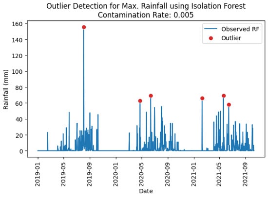 It can be observed in Table 8 that with a contamination level of 0.005, the Isolation Forest model achieved perfect outlier detection (recall = 1.00) across stations but exhibited reduced precision due to false positives (Table 9), indicating over-prediction of outliers in most of the stations except for Phiangluang station. However, the XGBoost model performed poorly in maximum rainfall outlier detection where the true outliers were only successfully found at Phiangluang and Veunkham stations according to the classification results and confusion matrices presented in Table 10 and Table 11. No outliers were detected at Thalad and Pakkayoung stations. This low detection rate may be attributed to the limited number of true outliers in the rainfall time series (only two in the training period), which likely hindered the model’s ability to learn the underlying outlier patterns during training, resulting in failure to detect them in the testing period. The maximum rainfall outliers identified at station Phiangluang by both the Isolation Forest and XGBoost models are demonstrated in Figure 3 and Figure 4.