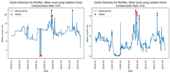 Minimum/maximum water level outliers identified at station Thalad (left) and Veunkham (right) using Isolation Forest model.