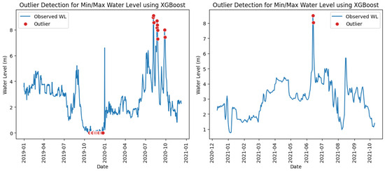 The XGBoost model consistently outperformed the Isolation Forest in detecting both minimum and maximum water level outliers, achieving high performance metrics across all stations, as summarized in Table 14. Unlike its relatively poor performance in detecting maximum rainfall outliers, the XGBoost model yielded promising results for both minimum and maximum water level outliers. This demonstrates that the performance of a supervised learning algorithm can be significantly enhanced when sufficient labeled datasets are available, which was further proven by the low counts of false positives and false negatives obtained from the XGBoost model, as reported in Table 15.